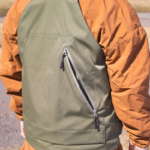 両サイドはベルトになっており、サイズの調整が可能。体格を選ばないことはもちろん、アウターの上からでも羽織りやすくなっています。背面にはリュックのように物をいれられる大きなポケットが付いているので、手ぶらでも過ごしやすいなど、さまざまな状況に対応しやすいベストです。
