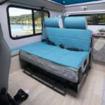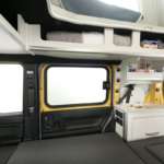 ヨーロッパのキャンピングカーに使われている素材と同じ断熱性の高いパネルを採用し、車内はいつでも快適な空間に。インテリアは落ち着いたモダンデザインの家具で統一されている。高機能軽キャンパーをスマートに乗りこなしたい人におすすめ。