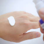ここで、ムラなく塗る方法を。パール1個分程度を手に取り、スキンケアをした後の肌に乗せ、写真のようにおでこ、あご、左右の頬4箇所をベースにするとムラなく塗りやすくなります。少量を薄く伸ばすとムラになりやすいので、顔全体にムラなく塗れる量を使用するのがポイントです。