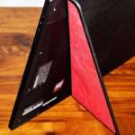 ▲革製カバーの一部にキックスタンドを内蔵している。スタンドの内側には、赤い人工スエード “アルカンターラ” を貼るなど質感も追求している