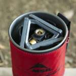▲着火装置が付いていないので、ライターなどを使用して着火する。最初は青い炎が出て、徐々に赤くなる。火が点いているかはインジケーターワイヤーで確認できる。火口周囲の風防部分にポットをはめるので、風の影響を一切受けない。これが早沸きの最大の武器となっている