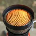 ▲一般的なシングルバーナーとは異なり、面積の広いメッシュ状の火口になっている。火を点けると徐々に赤くなっていき、メッシュ部分全体から炎が上がる。この炎がポット下部に付いている扇風機の羽のようなヒートエクスチェンジャーに当たり超高効率で熱を水に伝える仕組みになっている