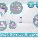▲人体に影響がない0.05ppm以下の揮発化された次亜塩素酸ガスを放出する機能も搭載。家具などの付着菌にも効果を発揮する