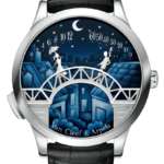 舞台はパリの夜。きらめく星空の下、セーヌ河にかかる橋。そこで落ち合い、また離れる男女の恋人たちの姿をレトログラード(往復運動) 機構で表現しながら、ふたりの位置で時刻を表示する。物語と時刻表示を巧みに両立した、ロマンティックでファンタジックな腕時計。ケース径42mm、自動巻き、ホワイトゴールドケース、3気圧防水