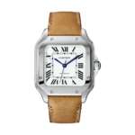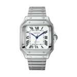 2018年に登場した「サントス ドゥ カルティエ」の定番モデル。文字盤はローマ数字インデックスにレイルウエイ分目盛り、ブルースチール針という伝統的なスタイル。ブレスレットはボタンを押すだけで簡単に交換可能で、その長さ調節も簡単。ケース径41.9×35.1mm、自動巻き、SSケース&ブレスレット(カーフストラップ付属)、10気圧防水