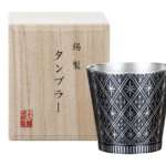 焼酎のロックや水割りに向いた錫製タンブラー。表面には切子のような繊細な模様が施され、天然の漆で色付けされている、手の込んだ酒器。専用の桐箱入りでギフトにも打ってつけだ。容量はすりきりで約315cc。