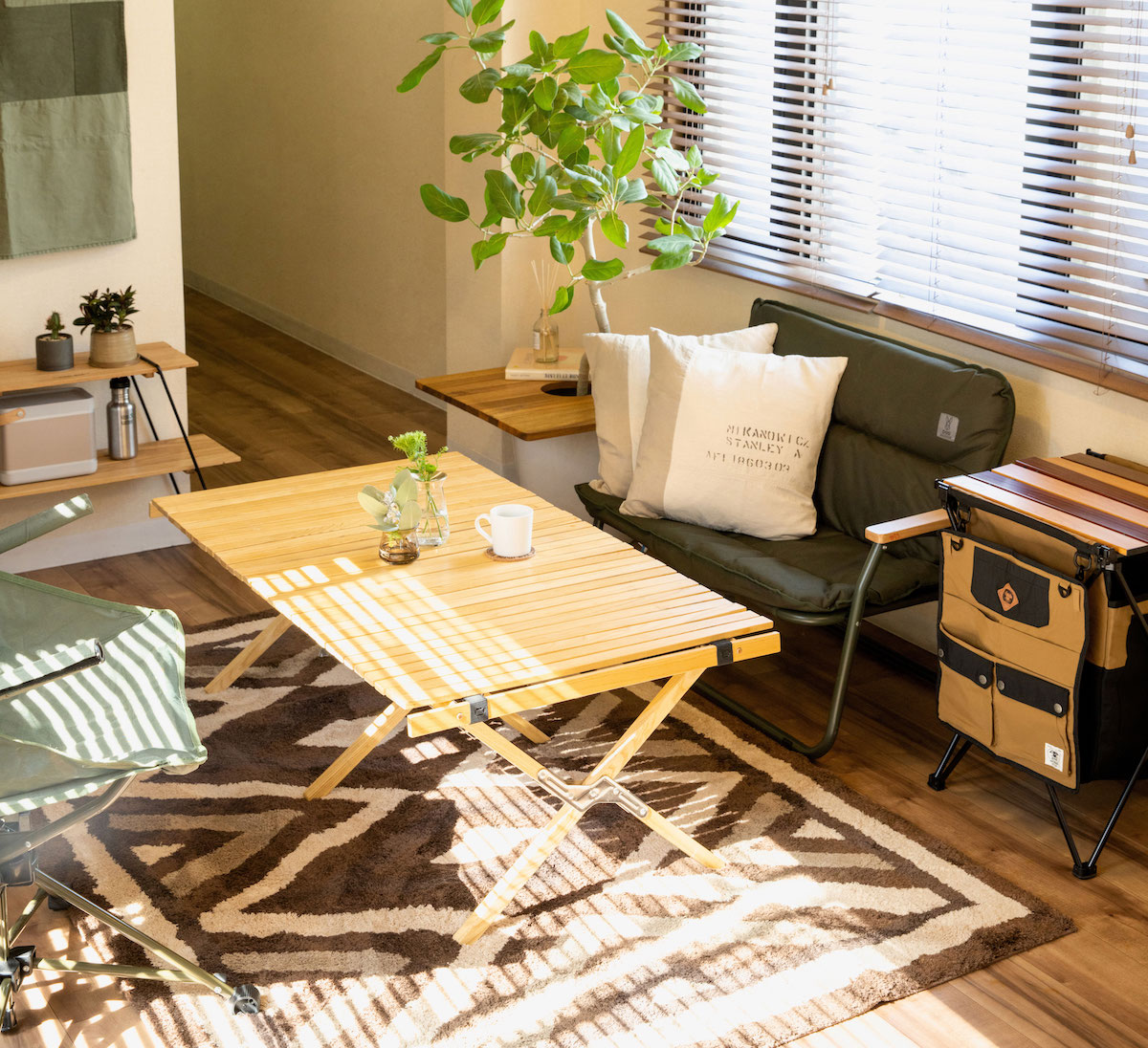 「アウトドアブランドやキャンプ用のアイテムを取り入れるのが一番手っ取り早いと思います。一般的な家具とはデザインが大きく異なるので、部屋の雰囲気をガラリと変えることができます。価格も比較的お手頃なのもポイントです」
