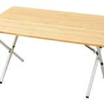 天然木をラッカー塗装したウッドテーブル。アウトドア用テーブルとしては大型の天板を採用しており、リビングのローテーブルとしても活躍する。シンプルながら存在感があり、幅広いインテリアになじむ。W120×D70×H43cm