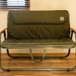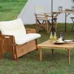 ソト・ナカ兼用の組み立て式ソファ。クッションはエアー仕様で弾力性があり、座り心地も快適。天然木のアームレストなのでリビング設置時の見た目も良い。付属のバッグにコンパクトに収納できる。W216×D70×H75cm