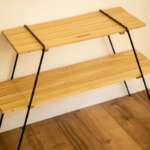 簡単に組み立てられるウッドシェルフ。温もりのあるアッシュ木の天板と、黒のスチールフレームのコンビが洗練された印象を与える。高さは27cm前後。長い天板のサイズはW80×D25×H1cm、短い天板はW60×D25×H1cm