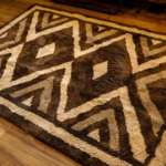 毛足が短く扱いやすいリビングラグ。触り心地はフワフワ。落ち着いた色合いながら、USプリミティブな雰囲気のデザインが個性的。裏には滑り止めが付いており、床暖房・ホットカーペットに対応する。W200×D140cm