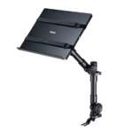 シートレールに固定できるノートPCスタンド。複数の関節を備えるほか、ポールを回転させることで自在な位置に設置可能。未使用時にはコンパクトに折り畳める。重さは約2kg。