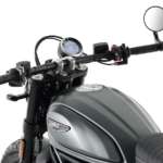 ▲1100 Sport Proから受継いだ幅広なストレートハンドル。エンド部にミラーを直付けするカフェレーサースタイルとした