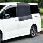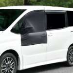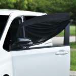 ▲ドアと窓を開けて下に引っ張りながら装着。サイズは幅1210×高さ850mm。運転席側と助手席側用に分かれている