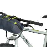 ▲収納した防水ロールトップ式スタッフサックはハンドルバーやフロントフォークなど様々な場所に固定可能