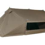 高さある前室とアレンジ自在なキャノピーが特徴のソロ用2ルームワンポールテント。無駄のないコンパクトな設計ながら、焚き火も楽しめるような素材や巻き上げ構造のスカートなど細部にもこだわりがみえる一張。
