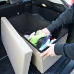 荷室に置けば小物などを整理整頓できる収納ボックスに。外に持ち出せば上に座ってイスとして、またほかのチェアと合わせて足置きとしても使用できる。素材のPUレザーは高級感があり、車内の雰囲気とも相性がいい。直販サイト「サンワダイレクト」限定販売商品。