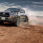 2020年8月のマイナーチェンジで大型の台形グリルが装着され、タフさがアップしたハイラックス。このタイミングで追加されたオキサイドブロンズメタリックはくすんだ淡いグリーン系のメタリックで、荒野を連想させるハイラックスらしいカラーです。