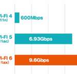 Wi-Fi 6の規格上の最大速度は9.6Gbpsで、Wi-Fi 4の600Mbpsから約16倍、Wi-Fi 5の6.93Gbpsの約1.4倍まで引き上げられた。この速度は規格上の最大値なので、実際の通信はこれよりも遅くなる。Wi-Fi 6対応のルーターとPCで通信環境を構築し、電波環境が良い場所で実測したところ、Wi-Fi 6の場合は転送速度は1.5Gbps程度だったが、同じ環境でWi-Fi 5が700Mbps弱、Gigabit Ethernetの有線LANが970Mbps程度だった。
