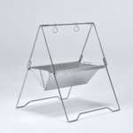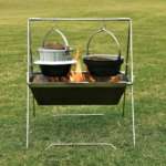 ▲別売りの「焚き火鍋18cm」(3300円)や「キャンプ羽釜3号炊き」(6900円)などを二台横に並べ、吊るしての調理が可能だ。サイズは46×49×H55cm、重量3.8kg