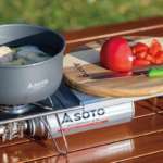 SOTOの定番製品で、ソロキャンパーにも人気の「レギュレーターストーブ ST-310」と組み合わせられるアイテム。コンロにちょっとした作業テーブルを追加することで、調理の快適さがグッとアップする。収納時には薄くコンパクトになるので、持ち運びもラク。