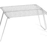 ▲焚き火などの熱源に設置すれば、その上にそのまま食材を載せて調理可能。使用時のグリル面は196×209mmで高さ114mm、収納時196×101×31mmのサイズ感もソロに最適だ