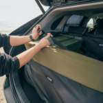 カーテン上部にマグネットを内蔵し、ウインドウ上部の金属部分に近づけるだけで簡単に貼り付く。吸盤式のようにウインドウに跡が残る心配がなく、取り外しも簡単。遮光率は100%で、UVの遮蔽率は99.9%以上。仮眠や車中泊のときにも車内をしっかり暗くして眠れる。