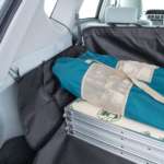 ラゲッジルーム全体をカバーできるクロス。耐摩耗性に優れ、汚れてもサッと拭き取れる素材。シートバックのほかラゲッジの両サイドもカバーしているので、バックドア側の面を持ち上げてベルトを固定すれば、荷物をスッポリと包める。使用しないときに収納しておける袋付き。