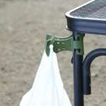 テントやタープのポールに挟んだり、テーブルの脚に挟んだりして取り付けるだけで袋や小物が吊るせるようになる便利クリップ。穴付きなので、S字フックの取り付けも可能。耐荷重は500g。