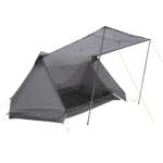 最小重量1150gの軽量2人用シェルター。側面をタープのように跳ね上げるなど、前室を自由にアレンジできる。写真は別売りのニンジャネストを内側に取り付けている。