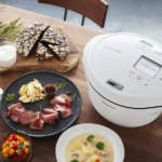 メニューごとに火加減を調整し、最適なタイミングでかき混ぜる電気調理鍋の最新版。かき混ぜ工程が進化し、独自のAIoTサービスとの連動で調理できるメニューが増加。本体の小型化で設置の自由度も高まった。容量2.4L。9月中旬発売。