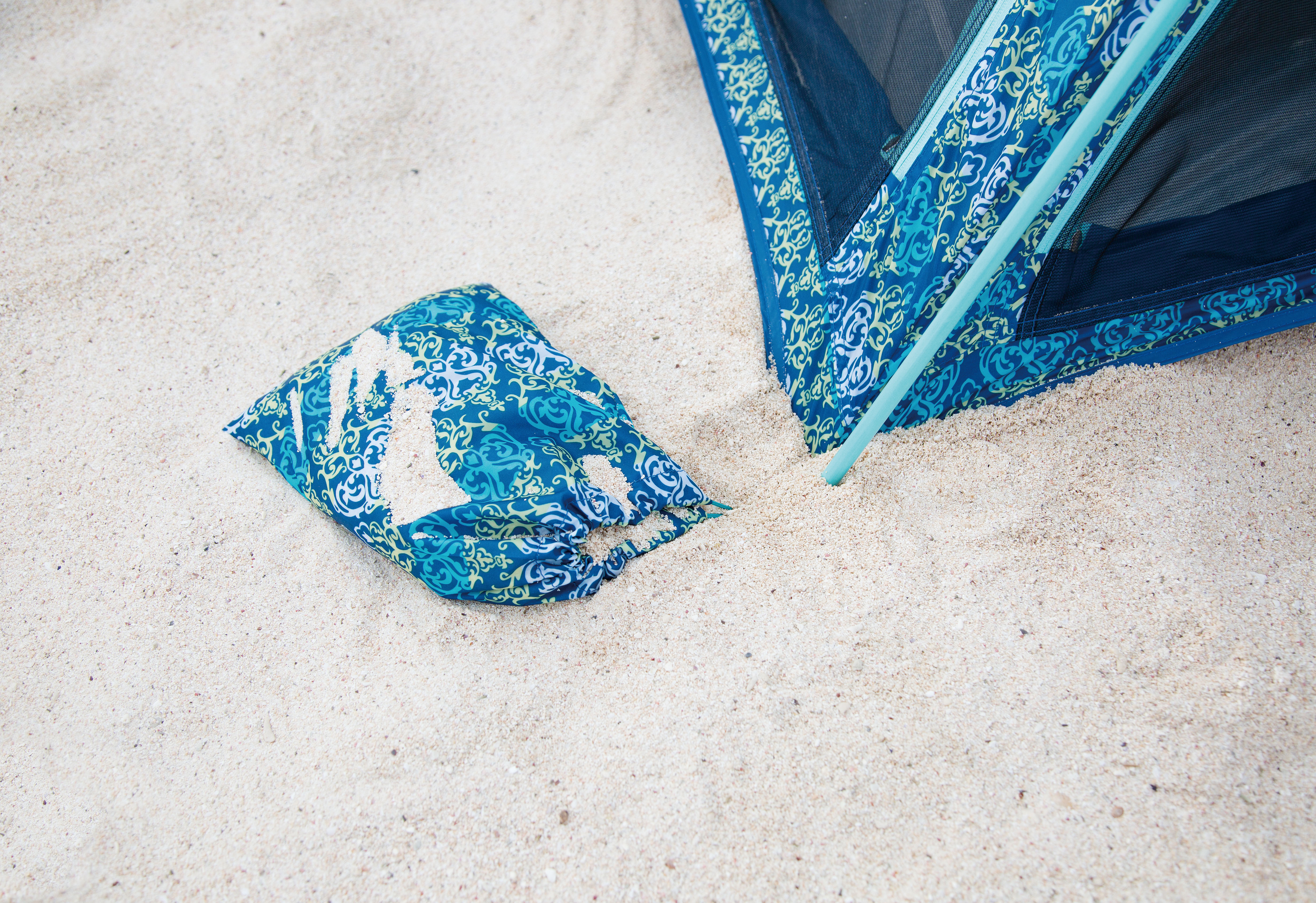 ちなみにメッシュ部分はすべてシートで覆うこともできるので、全面閉じてしまえば中で着替えもできます。また砂袋が4つ付いているので、ビーチでの固定も簡単です。