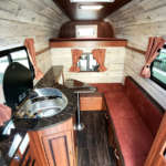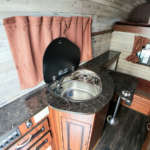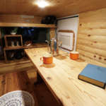 ▲シンクにはバーナーまで完備。壁は材木調クロスで心地良さを演出しつつ軽量化を実現