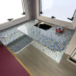 ▲インテリアは可愛らしいポップなデザイン。シャワーヘッド付きのシンクやテーブルも備える