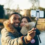 自撮り棒や、シャッターボタン、スタンドなどとして使えるスマホ用多機能カメラグリップ。幅60~85mmの端末を固定でき、スティックは22.5cmまで伸ばせる。1/4インチの三脚ネジにも対応する。