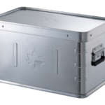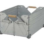 ガルバニウム鋼板で作られた通称“シェルコン”。狭い場所では閉じ、サイトではガバっと開いて重ねられる構造は唯一無二。開いた状態で重ねれば下段でも中を確認しやすく、見た目以上に使いやすい。積み重ねは最大3個。
