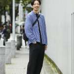 ▲キレイめなストライプ柄のクレリックシャツが、リラックス感と大人の余裕を演出。ソリッドな色合いのバッグが後ろ姿を引き締める