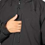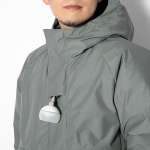 左脇には、着脱しやすくするために身頃の半分を超えるほど開くファスナーを備え、さらにフロントにはスナップボタンを使用し、アノラックフーディの弱点である着脱しにくさを補っています。