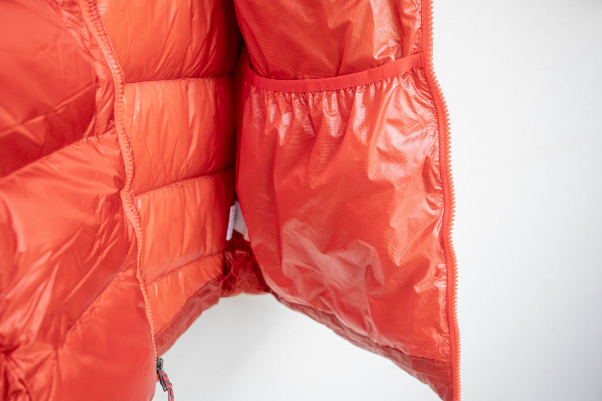 大きく作られた左前身頃の内ポケットは、入り口に伸縮性があり、出し入れしやすく飛び出しにくいという特徴が。表地には撥水効果の高いDWR加工が施されているため、水滴からダウンと身体を保護してくれます。