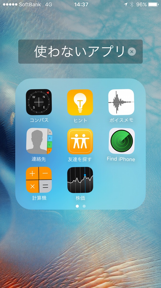 株の取り引きをやらない人にとって、株価などのアプリは邪魔なだけですが、今までは消すことができませんでした。なので“いらないアプリ”といったフォルダを作ってまとめておき、別ページに置くなど工夫を凝らしていた人も多いのではないでしょうか。それがついに、画面から消せるようになりました。