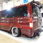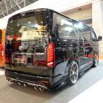 「機動性と機能性の両立」をコンセプトにしたADDSETのハイエース。225/35R20という大径タイヤで足元から迫力を高めています。そしてフロントリップスポイラーとマフラーカッター、オーバーフェンダーでワイド感とロースタイルを強調。