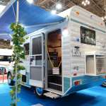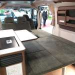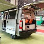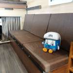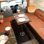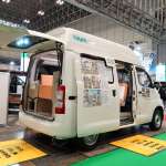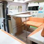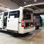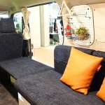 展示車両は2列目席が2人掛けで、背もたれを前に倒せば後ろ向きに座ってくつろげるバタフライ機能を搭載した仕様。他にも2列目を1人掛けにして横向きソファを備える1人掛けバタフライ仕様、1人掛けと2人掛けの冷蔵庫家具仕様が用意されています。