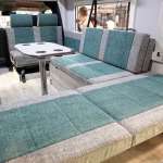 インテリアはデニム柄のシートでアクティブな雰囲気に。キャビンは横座りタイプのソファを採用。そしてフロアは防水重歩行フロア+クッションフロアの2フロアシステムを採用しています。