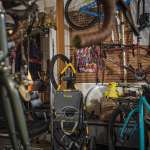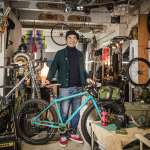 ▲仕事場である自らのスタジオの壁面にも組み立てやメンテナンス中のフレームなどが掛けられている。荷物が多いときには、中央にあるカーゴを引いていく