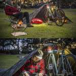 ▲ツーリング&キャンプも趣味のひとつ。自転車自体をロープとペグで固定し、タープの支柱に使うなど、独自のアイデアで楽しんでいる