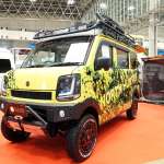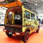 スズキ エブリイをベースに3インチのリフトアップ、ウインチバンパーガード、オーバーフェンダーなどでミリタリーな雰囲気に仕上げられたノースハンター。蛍光イエローのボディカラーは大自然の中で自車の存在を見失わないようにするという“機能性”を重視して採用されたもの。