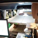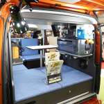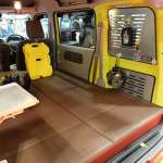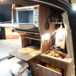 インテリアはブラウン基調でアクセントとしてアルミパネルを使用。パネルにはフックをつけられるので、車内を自在にアレンジできます。リア左側に設置されたコンパクトなテーブルは取り外せるので、車内で寝そべった時に枕元で使用したりすることもできます。