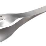 先割れスプーン、ナイフ機能付きフォークのセット。ソロキャンプならこれだけで過不足無く食事ができるうえ、組み合わせればトングにもなり調理で重宝する。タフでクリーンなステンレス製で長く使える。