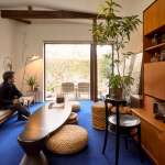 ▲鮮やかなコバルトブルーのカーペットが敷かれたリビングには、二面の大きな窓。開放感があり、外の植物の緑も取り入れて部屋の演出の一部に