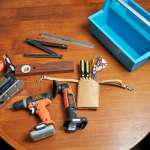 ▲窪川さんが仕事や自宅の修理に使っている工具類。電動工具は汎用性が高いブラック・アンド・デッカー。小物は美容師用のシザーケースに入れて作業する